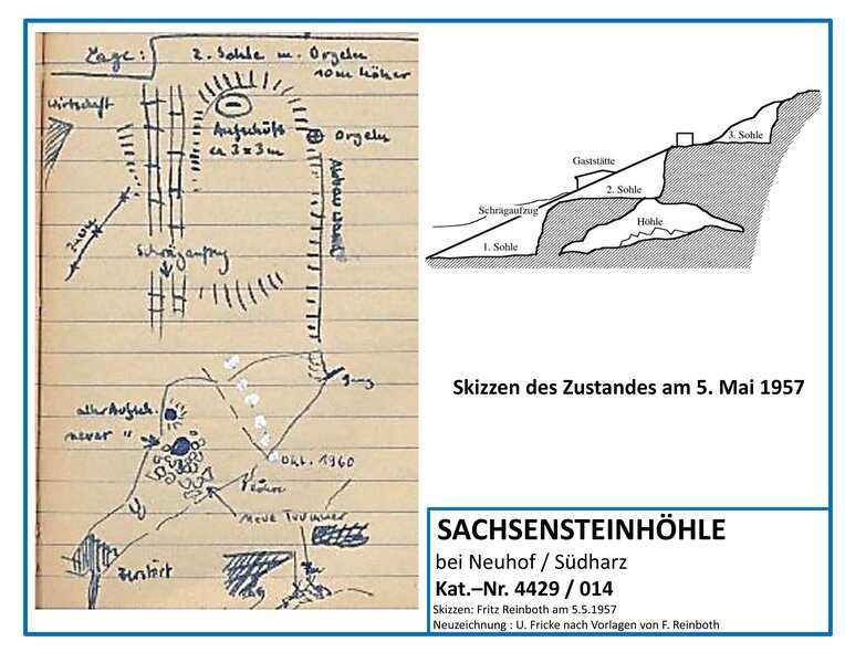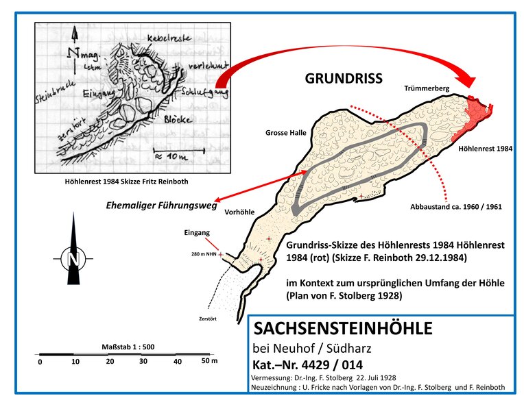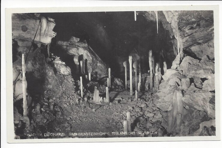 The cave was situated in gypsum karst, in the southern extension of the Sachsenstein, near to the Braunschweigian village of Neuhof. The entrance was first opened by quarrying operations around the year 1860 and subsequently covered again. In 1928, the entrance was excavated again, and on May, 5th 1929 opened as a show cave. Dr.-Ing. Friedrich Stolberg, a pioneering member of the Harzer speleology, wrote in 1930: „The main attraction of the Sachsensteinhöhle as a show cave consists … in the generous spatial impression combined with the subterranean sea of boulders. The location in the immediate neighbourhood of the bath Sachsa should also carry the precondition of a reasonably favourable economic development.“