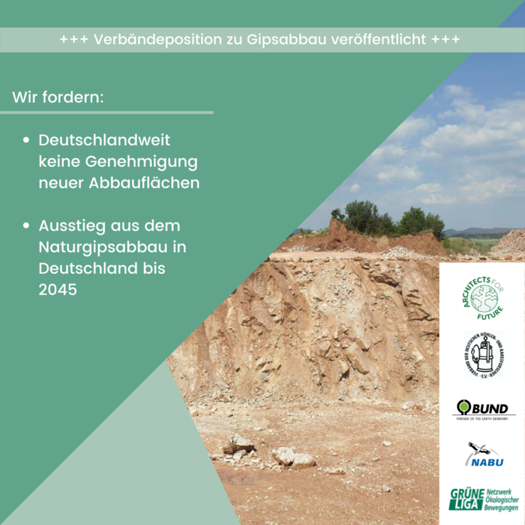 Environmental associations in Germany are calling for a medium-term phase-out of natural gypsum mining in Germany by 2045 and no approval of new mining areas. In a joint position paper, the GRÜNE LIGA, Naturschutzbund (NABU), the Bund für Umwelt und Naturschutz Deutschland (BUND), as well as the German Speleological Federation (VdHK) and the Architects for Future (A4F) initiative call for a fundamental rethink in the construction sector.